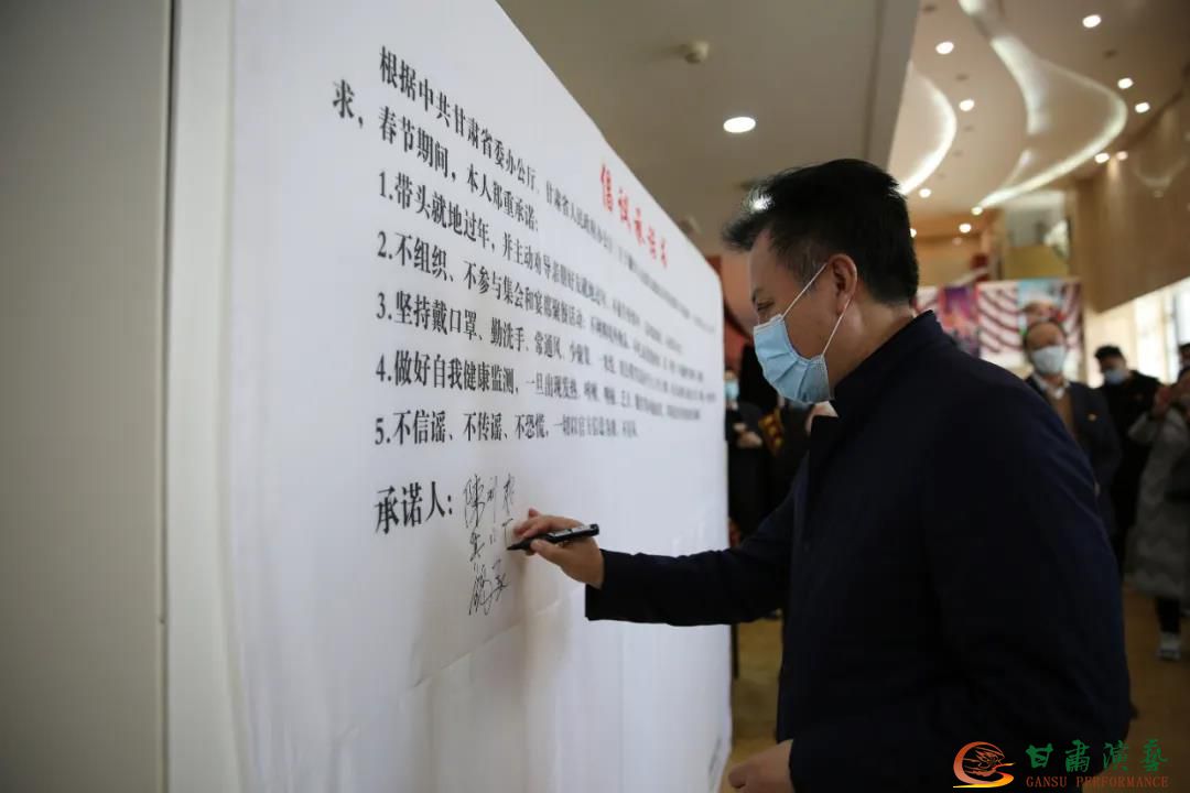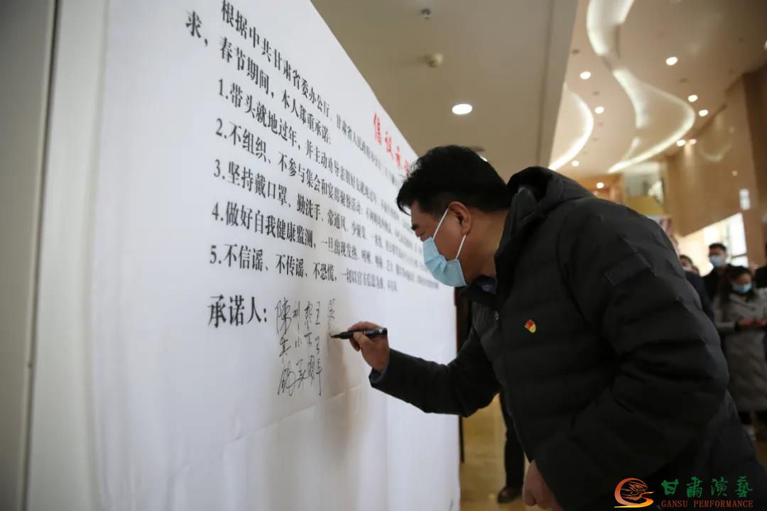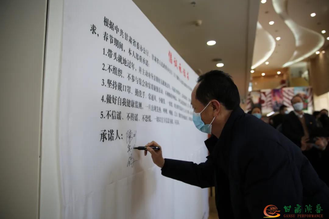 根據(jù)中共甘肅省委辦公廳、甘肅省人民政府辦公廳《關(guān)于做好人民群眾就地過(guò)年服務(wù)保障工作的通知》(甘辦發(fā)電〔2021〕19號(hào))要求,在甘肅演藝集團(tuán)黨委書(shū)記、董事長(zhǎng)陳其銀及集團(tuán)領(lǐng)導(dǎo)班子成員的帶領(lǐng)下,所有參加活動(dòng)的黨員及入黨積極分子簽訂帶頭就地過(guò)年倡議承諾書(shū)。
