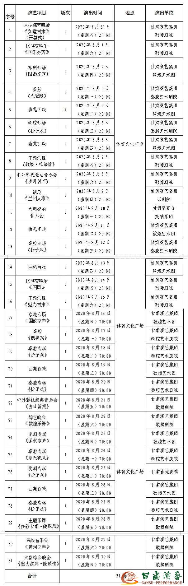 藝術(shù)節(jié)演出內(nèi)容涵蓋歌舞、民族交響樂(lè)、戲劇、曲藝、兒童劇、舞劇、話劇等多種藝術(shù)形式,共計(jì)演出100場(chǎng)。藝術(shù)節(jié)主場(chǎng)館設(shè)在蘭州市體育公園,每晚8時(shí)演出一場(chǎng),由省直藝術(shù)院團(tuán)輪番上演大型綜藝晚會(huì)《如意甘肅》《敦煌樂(lè)舞》《魅力絲路·隴原情》、民族交響樂(lè)《國(guó)樂(lè)芬芳》《國(guó)風(fēng)》《黃河之聲》、主題樂(lè)舞《敦煌·絲路情》《魅力甘肅》《多彩甘肅·隴原風(fēng)》、音樂(lè)會(huì)《歲月留聲》、話劇《蘭州人家》、京劇《國(guó)韻京聲》、秦腔《大登殿》《鍘美案》《趙氏孤兒》,以及隴劇、秦腔折子戲?qū)?chǎng)和曲藝綜合晚會(huì)《曲苑百戲》等經(jīng)典劇目,共計(jì)演出31場(chǎng),每場(chǎng)一個(gè)主題。分劇場(chǎng)設(shè)在黃河劇院、東風(fēng)劇院、人民劇院、77演藝工場(chǎng)等演出場(chǎng)所,著力打造音樂(lè)會(huì)+戲曲+兒童?。拕〉难莩鲂问?,主要上演大型戲曲綜藝晚會(huì)《梨園風(fēng)采》、京劇《梨園春色-折子戲》、秦腔《清風(fēng)亭》《火焰駒》、隴劇《假婿乘龍》、音樂(lè)劇《花兒與少年》、話劇《老柿子樹》、兒童劇《綠野仙蹤》和鋼琴重奏音樂(lè)會(huì)等凸顯甘肅文化特色的精品劇目和體現(xiàn)出甘肅文化名片的品牌劇目。