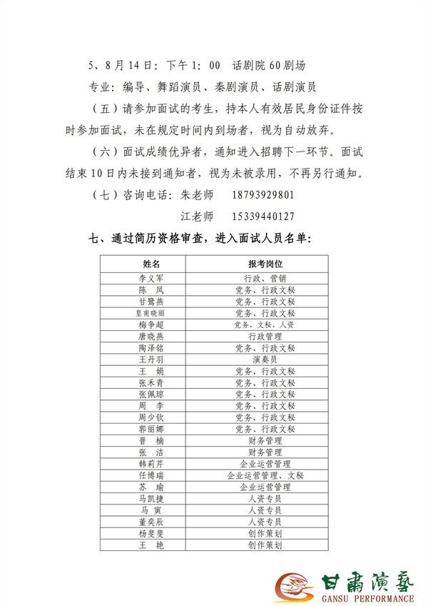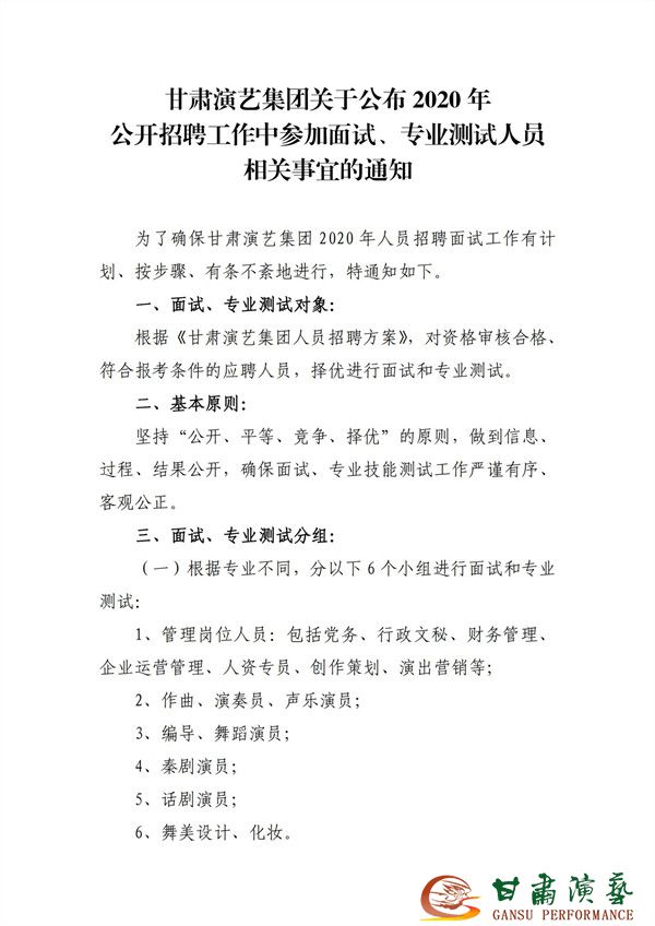 甘肅演藝集團(tuán)關(guān)于公布2020年公開招聘工作中參加面試、專業(yè)測試人員相關(guān)事宜的通知