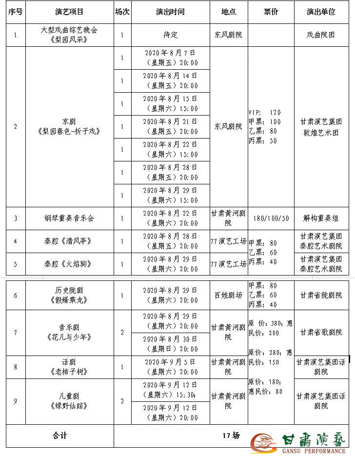 藝術(shù)節(jié)演出內(nèi)容涵蓋歌舞、民族交響樂、戲劇、曲藝、兒童劇、舞劇、話劇等多種藝術(shù)形式,共計演出100場。藝術(shù)節(jié)主場館設(shè)在蘭州市體育公園,每晚8時演出一場,由省直藝術(shù)院團(tuán)輪番上演大型綜藝晚會《如意甘肅》《敦煌樂舞》《魅力絲路·隴原情》、民族交響樂《國樂芬芳》《國風(fēng)》《黃河之聲》、主題樂舞《敦煌·絲路情》《魅力甘肅》《多彩甘肅·隴原風(fēng)》、音樂會《歲月留聲》、話劇《蘭州人家》、京劇《國韻京聲》、秦腔《大登殿》《鍘美案》《趙氏孤兒》,以及隴劇、秦腔折子戲?qū)龊颓嚲C合晚會《曲苑百戲》等經(jīng)典劇目,共計演出31場,每場一個主題。分劇場設(shè)在黃河劇院、東風(fēng)劇院、人民劇院、77演藝工場等演出場所,著力打造音樂會+戲曲+兒童?。拕〉难莩鲂问?,主要上演大型戲曲綜藝晚會《梨園風(fēng)采》、京劇《梨園春色-折子戲》、秦腔《清風(fēng)亭》《火焰駒》、隴劇《假婿乘龍》、音樂劇《花兒與少年》、話劇《老柿子樹》、兒童劇《綠野仙蹤》和鋼琴重奏音樂會等凸顯甘肅文化特色的精品劇目和體現(xiàn)出甘肅文化名片的品牌劇目。