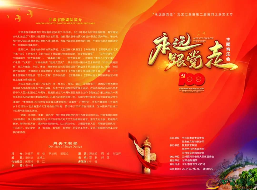 本屆黃河之濱藝術(shù)節(jié)由省委宣傳部、省文旅廳主辦,甘肅演藝集團、蘭州市委宣傳部、蘭州市文旅局承辦,蘭州黃河風(fēng)情線大景區(qū)管委會協(xié)辦,以“永遠跟黨走”為主題,著力營造學(xué)習(xí)宣傳貫徹習(xí)近平總書記在中國共產(chǎn)黨成立100周年大會重要講話濃厚氛圍,突出紅色精神,凸顯甘肅特色,聚焦“黃河之濱也很美”文化新名片,集中推出一批優(yōu)秀紅色舞臺作品,展示近年來甘肅文藝創(chuàng)作的豐碩成果和文藝工作者的精神風(fēng)貌。