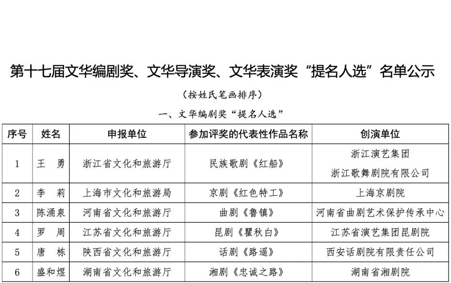 根據(jù)《中國(guó)文化藝術(shù)政府獎(jiǎng)——文華獎(jiǎng)?wù)鲁獭贰吨袊?guó)文化藝術(shù)政府獎(jiǎng)——第十七屆文華獎(jiǎng)評(píng)獎(jiǎng)辦法》有關(guān)規(guī)定,現(xiàn)將第十七屆文華大獎(jiǎng)終評(píng)作品名單和第十七屆文華編劇獎(jiǎng)、文華導(dǎo)演獎(jiǎng)、文華表演獎(jiǎng)“提名人選”名單予以公示(第十七屆文華音樂創(chuàng)作獎(jiǎng)、文華舞臺(tái)美術(shù)獎(jiǎng)無“提名人選”)。入圍終評(píng)的作品和“提名人選”所對(duì)應(yīng)的作品應(yīng)參加第十三屆中國(guó)藝術(shù)節(jié)現(xiàn)場(chǎng)演出,不能參加者視為自動(dòng)放棄評(píng)獎(jiǎng)資格。