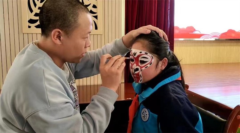 敦煌藝術(shù)團(tuán)藝術(shù)總監(jiān)孟慶波和京劇演員還與同學(xué)們展開了有趣的互動(dòng),為同學(xué)們講解了有關(guān)京劇的歷史發(fā)展、京劇各個(gè)行當(dāng)?shù)慕巧卣鳎故玖司﹦〉膴y容、服飾,講解戲曲中人物特點(diǎn),讓同學(xué)們直觀地了解了京劇文化。不少學(xué)生跟著演員們零距離地學(xué)習(xí)戲劇動(dòng)作與唱腔,現(xiàn)場(chǎng)體驗(yàn)了戲劇服裝穿戴,勾畫戲劇臉譜。同學(xué)們踴躍互動(dòng),掌聲和歡呼聲此起彼伏,臺(tái)上臺(tái)下成了一片歡樂的海洋。