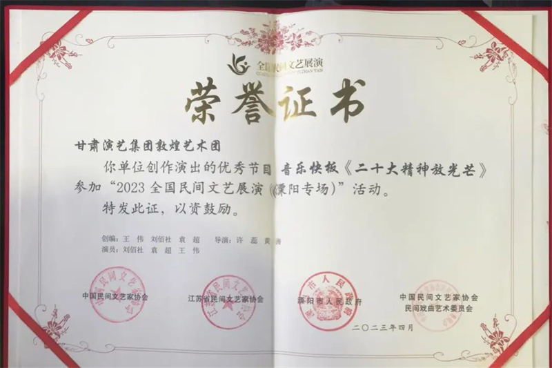 2023年4月20日至23日,全國民間文藝展演(溧陽專場(chǎng))在江蘇省常州市溧陽文化藝術(shù)中心劇院舉辦。甘肅演藝集團(tuán)敦煌藝術(shù)團(tuán)曲藝作品音樂快板《二十大精神放光芒》受邀參加。作品充分展示了昂揚(yáng)向上的精神風(fēng)貌,展望前景,目標(biāo)超前,凝聚起“奮進(jìn)新征程,建功新時(shí)代”的磅礴力量,以實(shí)際行動(dòng)學(xué)習(xí)貫徹、宣傳黨的二十大。節(jié)目一登臺(tái),便引來現(xiàn)場(chǎng)觀眾們的聲聲叫好,并榮獲了此次“溧陽專場(chǎng)”活動(dòng)優(yōu)秀節(jié)目獎(jiǎng)。
