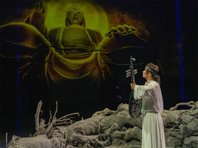 全球首部洞窟式沉浸體驗(yàn)劇《樂動敦煌》,溯源敦煌文化,借助對莫高窟壁畫、藏經(jīng)洞古籍的深度解讀梳理,活化敦煌古樂器、古樂譜研發(fā)成果,采用全息投影、3D威亞等高科技手段,以全沉浸式的呈現(xiàn)方式,演繹了西域少年白歆追尋藝術(shù)的動人故事。