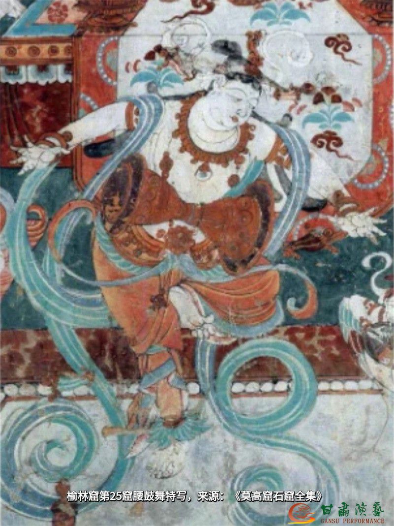 “腰鼓舞”在敦煌壁畫(huà)中多有出現(xiàn),榆林窟第25窟中天宮樂(lè)舞的舞伎,肩身披巾向左傾身、雙臂展開(kāi)、十指大張,正欲拍擊掛在腰間的腰鼓,舞伎曲起的左腿、用力翹起的腳拇指將其富有活力與力量的舞蹈形象生動(dòng)展現(xiàn)。