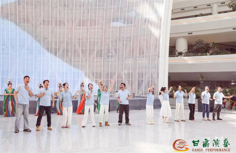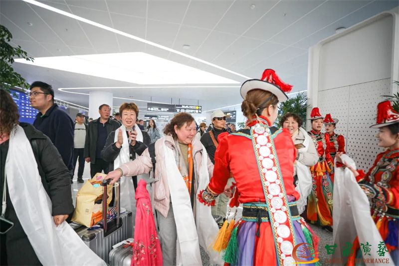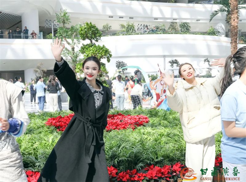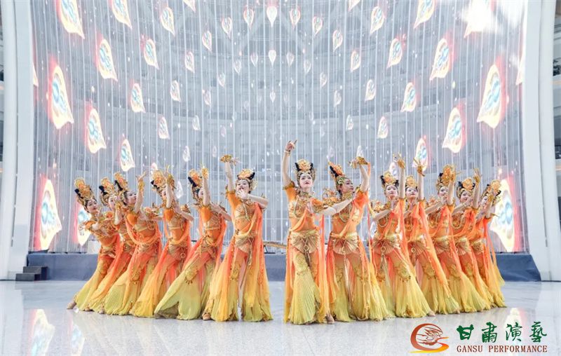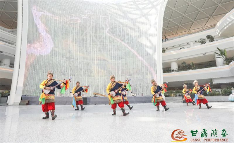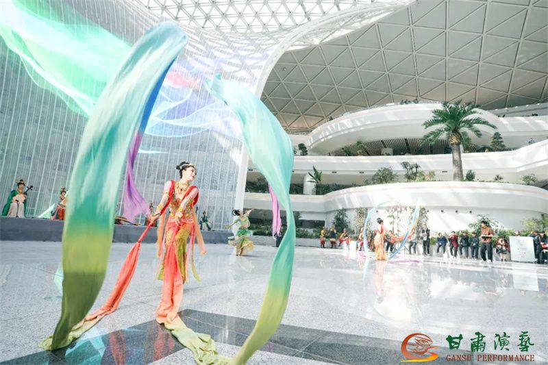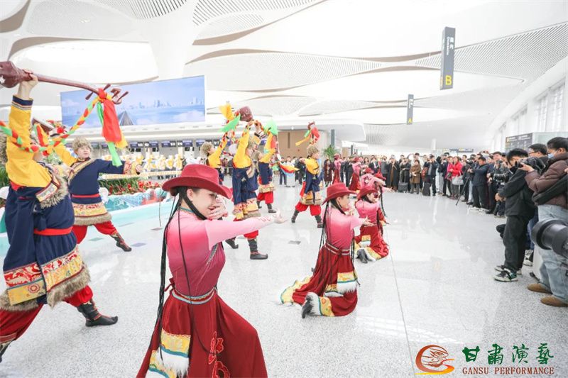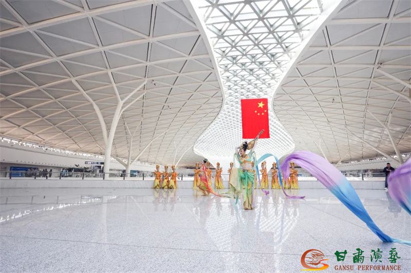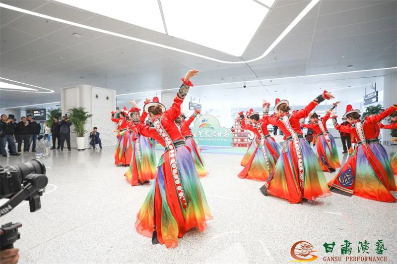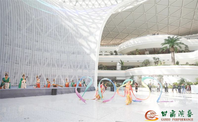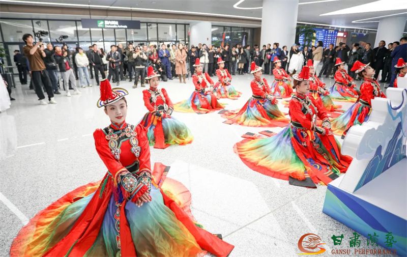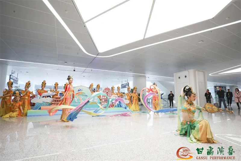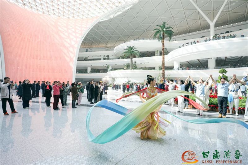 為使旅客和觀眾在這一新城市地標(biāo)建筑中感受不一樣的西北韻味,本次演出匠心獨(dú)運(yùn)注重“創(chuàng)意+體驗(yàn)”,在出發(fā)大廳、到達(dá)大廳、連廊大廳設(shè)三個(gè)快閃點(diǎn),交通樞紐大廳設(shè)置展演舞臺(tái),《絲路花雨》經(jīng)典片段《金光千佛》拉開(kāi)活動(dòng)序幕,舞者身披金色華服,以曼妙舞姿再現(xiàn)莫高窟壁畫中“千佛齊現(xiàn)”的恢宏場(chǎng)景,祈愿往來(lái)游客起落平安,《反彈琵琶長(zhǎng)綢舞》演員手持琵琶翩然起舞,長(zhǎng)綢翻飛間,敦煌藝術(shù)的靈動(dòng)與絲路文明的交融之美躍然眼前,跨越千年的石窟藝術(shù)與航站樓現(xiàn)代設(shè)計(jì)交相輝映,引得旅客紛紛駐足拍攝,裕固族舞蹈《歡騰的草原》展現(xiàn)甘肅人民的熱情好客、淳樸熱情以及甘肅豐富的歷史文化和民俗風(fēng)情,《玄奘西行》《雪域歡歌》《花兒美》則展現(xiàn)出甘肅多元文化的美妙厚重與自然風(fēng)光的壯美神秘。隨著《我把甘肅唱給你聽(tīng)》的旋律漸息,這場(chǎng)跨越時(shí)空的藝術(shù)之旅圓滿落幕,中川機(jī)場(chǎng)T3航站樓化身“流動(dòng)的藝術(shù)展廳”,把“交響絲路·如意甘肅”的壯美畫面描繪在了每一位旅客心中。