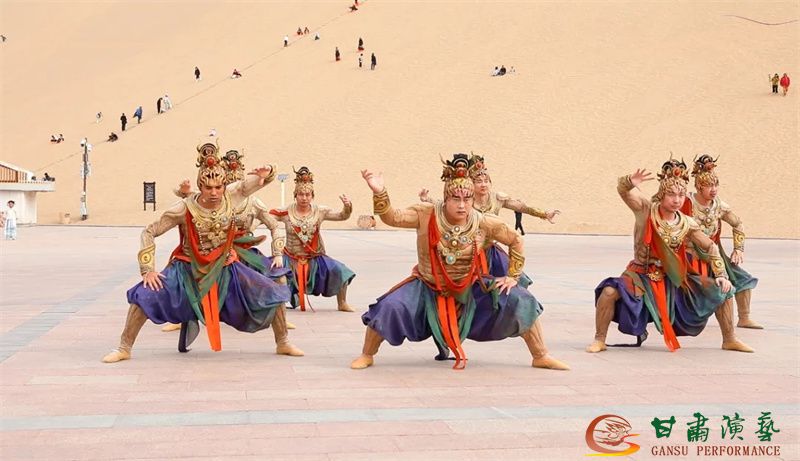 活動(dòng)現(xiàn)場(chǎng),團(tuán)員青年以“敦煌舞韻”為核心,在鳴沙山呈現(xiàn)了一場(chǎng)別開(kāi)生面的實(shí)景演出。他們身著敦煌服飾,化身“飛天”“伎樂(lè)師”“胡騰舞者”“金剛力士”等經(jīng)典形象,演繹《樂(lè)動(dòng)敦煌》劇目經(jīng)典舞段,配合音樂(lè)翩然起舞,再現(xiàn)壁畫(huà)中的敦煌樂(lè)舞。