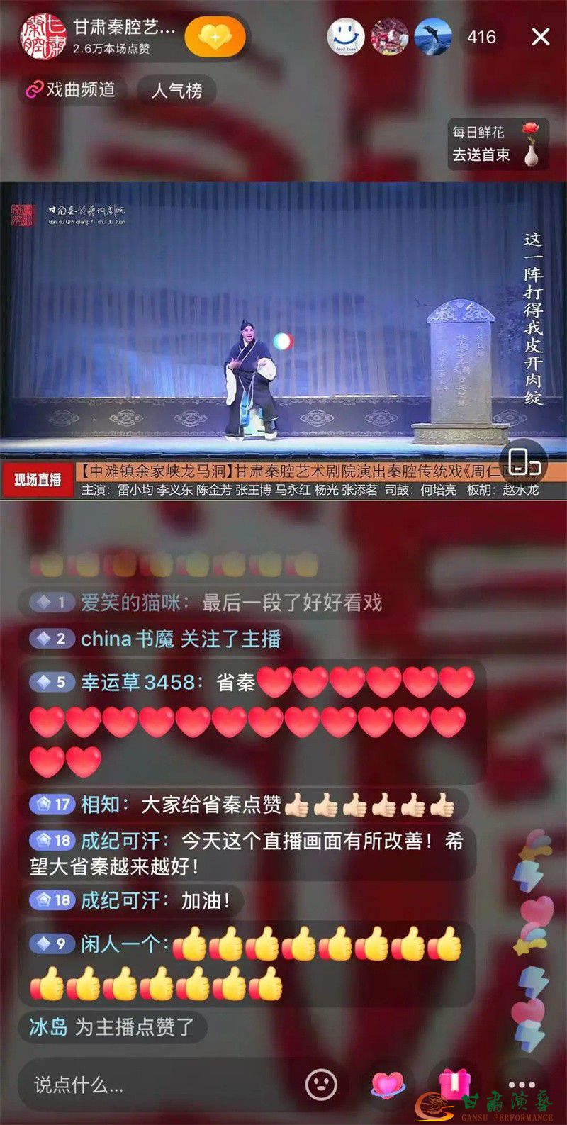 此次峪口村、余峽村巡演中,劇院首次嘗試“線下演出+線上直播”雙線模式,通過(guò)抖音、視頻號(hào)等平臺(tái)同步直播,甘肅演藝集團(tuán)官方平臺(tái)全程轉(zhuǎn)播,讓秦腔藝術(shù)突破地域限制,走進(jìn)千家萬(wàn)戶?!跺幟腊浮贰痘鹧骜x》《鎖麟囊》(青春版)《金沙灘》《清風(fēng)亭》等經(jīng)典劇目輪番上演,臺(tái)上演員水袖翻卷、唱腔鏗鏘,臺(tái)下觀眾掌聲喝彩聲不斷,兩站演出累計(jì)線上觀眾100萬(wàn)人次。網(wǎng)友紛紛留言:“秦腔直播太上頭,老戲新唱有味道!”“隔著屏幕都感受到現(xiàn)場(chǎng)的火熱!”傳統(tǒng)戲曲與新媒體的深度融合,不僅為鄉(xiāng)村百姓送去文化盛宴,更讓年輕群體領(lǐng)略到秦腔的獨(dú)特魅力。