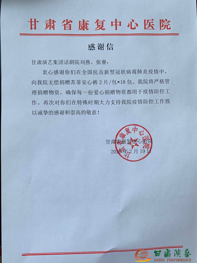 在抗擊疫情的特殊時期,話劇院舞美工程部化妝師劉燕、張睿兩位同志,一直心系一批批甘肅支援武漢的醫(yī)護人員,經(jīng)過兩位同志一直細心關注新聞媒體關于特殊時期醫(yī)護人員的工作報道,兩位同志決定將自行購買的女士用品“安心褲”捐贈給甘肅支援武漢的女性醫(yī)護人員。“我們想,醫(yī)護人員被不透氣的防護服包裹,為了提高醫(yī)護效率,醫(yī)護人員們穿著成人的尿不濕,女性醫(yī)護人員在生理特殊期時怎么辦?我們就決定將不多的幾包“安心褲”轉(zhuǎn)交給甘肅支援武漢的女性醫(yī)護人員”,劉燕真情實意地表達著。當劉燕和張睿聯(lián)系到甘肅省康復中心醫(yī)院護士部主任后,她們兩將湊到一起的幾包“安心褲”于2月19日中午親手交給甘肅省康復中心醫(yī)院一位姓陳的主任手中。這份愛心善舉,給予即將支援武漢的第六批醫(yī)護人員動力和信心,甘肅省康復中心醫(yī)院向兩位同志回復了感謝信,看著感謝信劉燕輕輕的說:“醫(yī)院這么忙,我們沒有想到有感謝信,能做點啥就行”。疫情無情人有情,兩位同志心系一線醫(yī)護人員,看似平凡,卻彰顯人間大愛的善舉,譜寫著眾志成城的真情和聲。