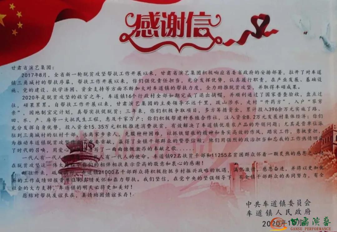 演出開始前,中共車道鎮(zhèn)委員會(huì)、車道鎮(zhèn)人民政府為甘肅演藝集團(tuán)贈(zèng)送了一封感謝信,并對(duì)甘肅演藝集團(tuán)三年來(lái)的對(duì)口幫扶工作給予了高度肯定和衷心感謝!