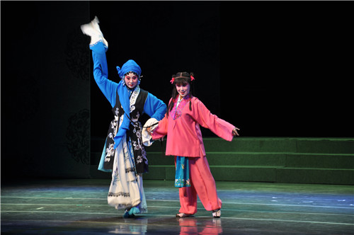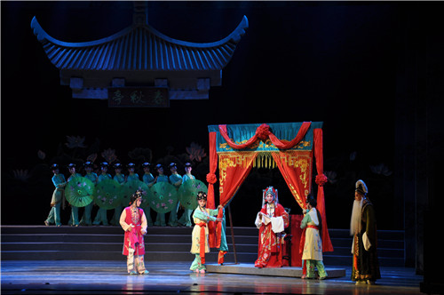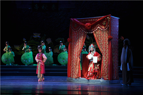 麟兒玩耍中拋球入一小樓,促湘靈去取,湘靈登樓,見昔日之"鎖麟囊"供奉桌上,不覺感涕。趙守貞見狀盤詰,方知湘靈為當(dāng)年贈(zèng)囊之人,敬為上賓,結(jié)為金蘭,助湘靈一家團(tuán)圓。