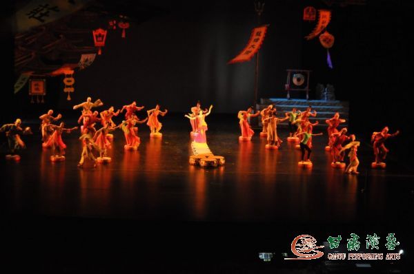 而舞美方面,主要從置景和服裝追求新的突破。置景的設(shè)計與制作,強(qiáng)化數(shù)字視頻制景和硬、軟景制作與道具的拼裝組合,使其便攜拆裝、適應(yīng)巡演運(yùn)轉(zhuǎn)之需的設(shè)計制作,尤其要特別突出舞臺立體展示的三維感、意境化等多視角色彩之效果。新版舞劇服裝設(shè)計以明亮的紅色、黃色、綠色為主基調(diào),大段大段的鮮艷綢緞傾瀉而下,再現(xiàn)了古絲綢之路曾經(jīng)的輝煌。
