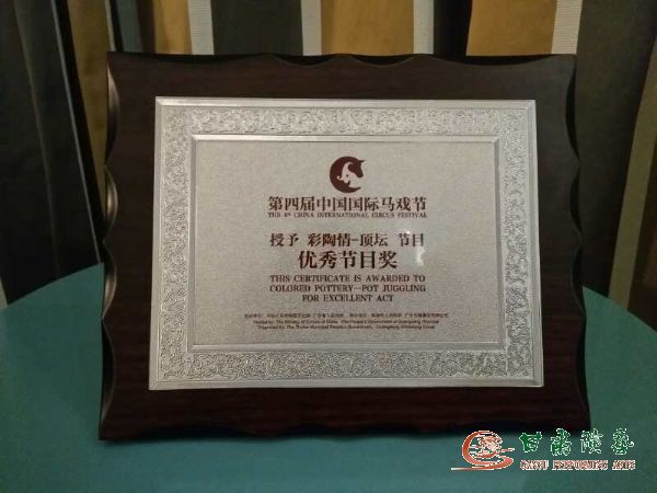 2017年11月22日至25日,甘肅省雜技團(tuán)情景雜技節(jié)目《彩陶情——頂壇》在珠海參加第四屆中國(guó)國(guó)際馬戲藝術(shù)節(jié),榮獲“優(yōu)秀節(jié)目獎(jiǎng)”。這是西北五省雜技團(tuán)在“中國(guó)國(guó)際馬戲藝術(shù)節(jié)”上的首次亮相,并獲得“優(yōu)秀節(jié)目獎(jiǎng)”。