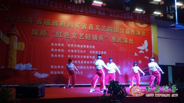 2018年9月19日,甘肅省話劇院參加隴原“紅色文藝輕騎兵”惠民演出的全體演職員,踏著秋天的腳步來到了定西市臨洮縣。一到演出的現(xiàn)場,演職員們干勁十足,搭起棚子、接上音響、拉上橫幅,一場豐富精彩的綜藝節(jié)目就這樣拉開帷幕。別看舞臺簡單,但演員們準(zhǔn)備的卻很充分,每一個演出節(jié)目都很精彩。反腐倡廉的幽默小品《錯位的造訪》不時引得村民們捧腹大笑,現(xiàn)代京劇《打虎上山》、歌曲獨唱《有你相隨》、《花開在眼前》、《向天再借五百年》、《熱情的沙漠》、動感十足的現(xiàn)代舞《屋頂著火》、相聲《懶漢糖葫蘆》、異域風(fēng)情的《波斯舞》、合唱《相親相愛》等節(jié)目引來村民們陣陣熱烈的掌聲。臺上演出生動、精彩,臺下觀眾情緒高漲、歡呼雀躍。甘肅省話劇院隴原“紅色文藝輕騎兵”演出小分隊將下基層演出的文藝節(jié)目緊密結(jié)合黨的十九大精神宣傳,送到了老百姓的心坎上,受到了老百姓的好評與稱贊!
