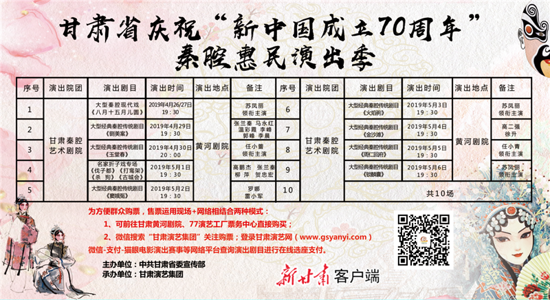 新甘肅客戶端蘭州4月21日訊(新甘肅·甘肅日報記者施秀萍)記者從有關(guān)方面獲悉,由甘肅省委宣傳部主辦,甘肅演藝集團承辦的“慶祝新中國成立70周年”秦腔惠民演出季將于4月26日正式啟幕。