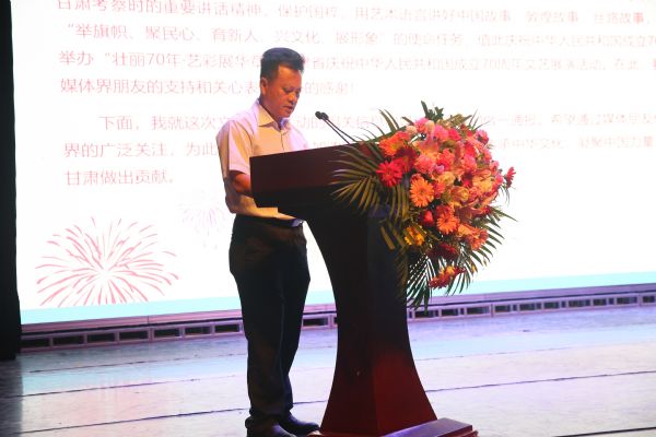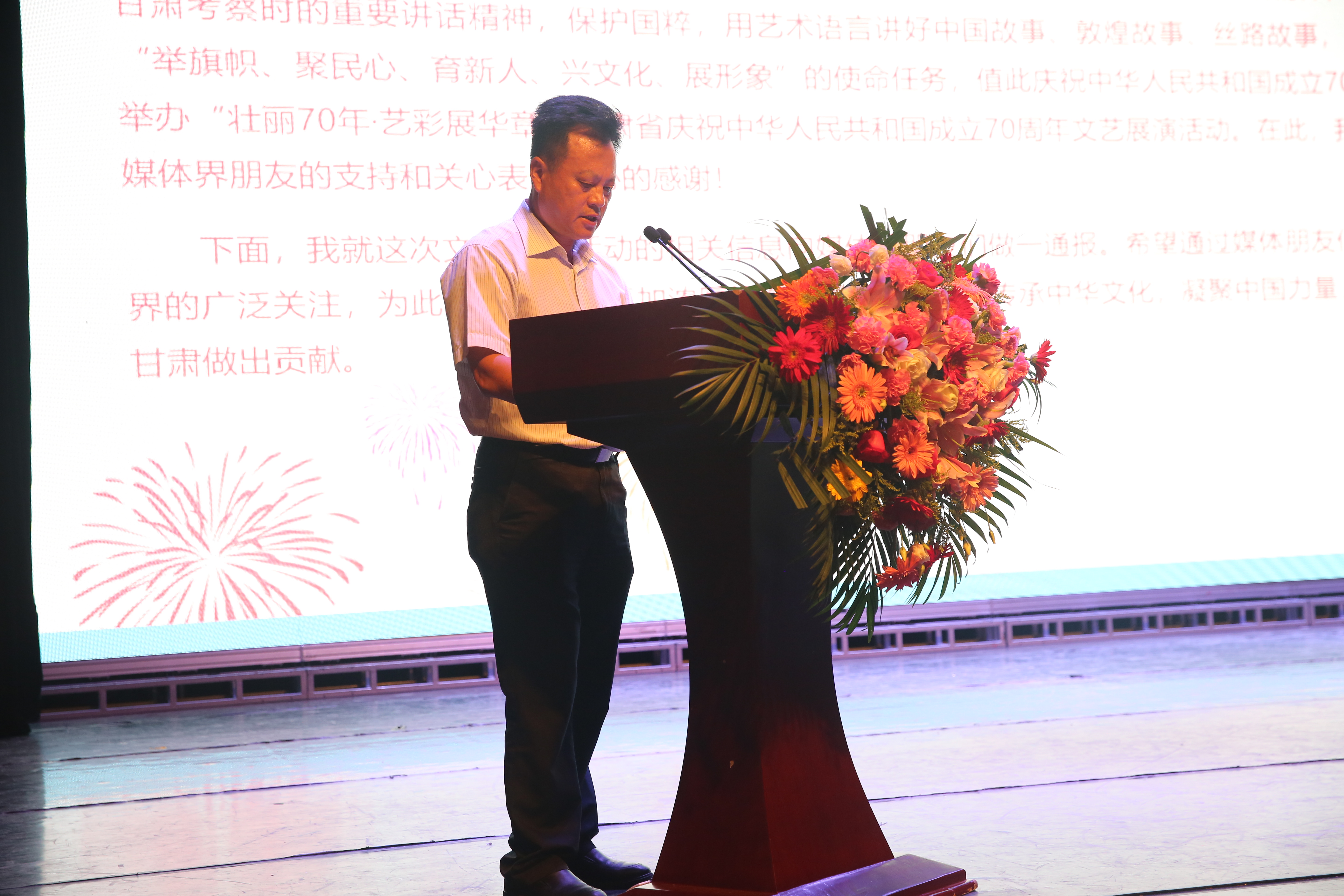 甘肅演藝集團(tuán)黨委委員、副總經(jīng)理龍富國出席通報(bào)會(huì)并作發(fā)言,他指出,此次展演旨在深入貫徹落實(shí)習(xí)近平總書記在全國文藝座談會(huì)和全國宣傳思想工作會(huì)議上的講話精神,深刻學(xué)習(xí)領(lǐng)會(huì)貫徹總書記在甘肅考察時(shí)的重要講話精神,主題是“壯麗70年·藝彩展華章”,由中共甘肅省委宣傳部、甘肅省文化和旅游廳主辦,甘肅演藝集團(tuán)承辦,演出單位是甘肅演藝集團(tuán)旗下歌舞劇院、話劇院、秦腔藝術(shù)劇院、敦煌藝術(shù)團(tuán)和甘肅省隴劇院、甘肅省歌劇院,展演共安排五個(gè)活動(dòng),時(shí)間為2019年8月30日至2019年10月25日。
